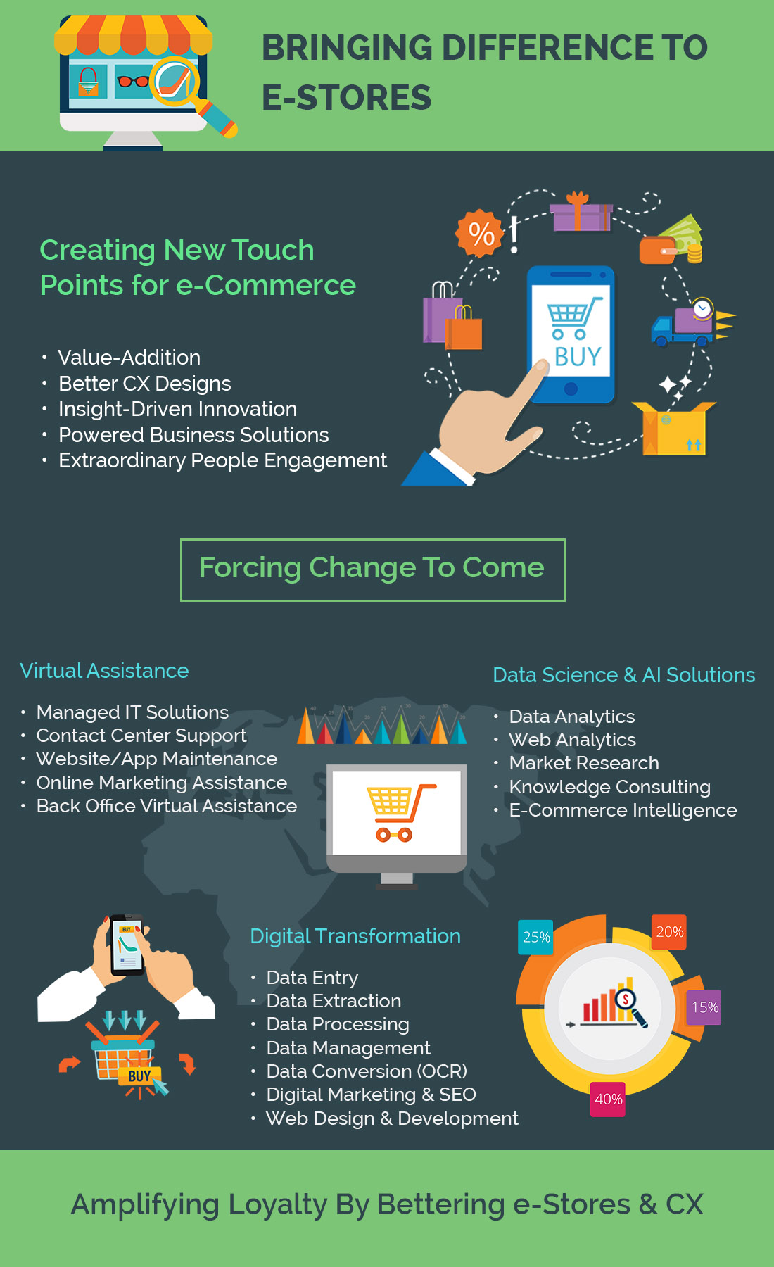 The most challenging job in this industry is to stand, sustain the stiff competition and digital transformation. Despite having a website, it’s not easy to onboard thousands of customers. You have to incorporate with the future technologies, customer support, knowledge consulting, business transformation and digitization. We’re expert in defining a digital life by putting business process management practices in place for e-selling . We see through challenges and analyse the journey of your target audience, scope of business and market trends. With digital data entry, we manage or upload products in a fast TAT. Also, we optimize feeds to submit on different websites of the same kind. In addition, you can have the most qualified marketing professionals and data scientists in your access. With them, you can catch up with the insights of your profitability, online performance and customer experience via data science & AI driven data analytics. These insights lay the foundation of prospective changes that can actually attract more traffic, visibility and top rank in Google or other search engines / social media. In short, we administer your requirements.