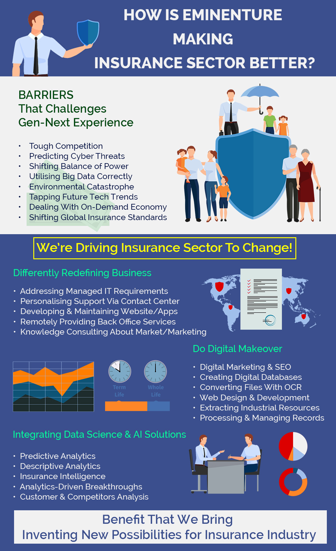 Insurance industry needs transition. Onboarding customers and consistently performing better in the changing scenario are leading challenges that interrupt growth and high returns. Eminenture is the world’s leading IT/BPM Company, ensuring a smarter corporate lives to defeat these challenges via innovation. It supports customised solutions with a definite deliverability. This happening ensures satisfaction level to reach maximum limits, which results in an overwhelming outcome.