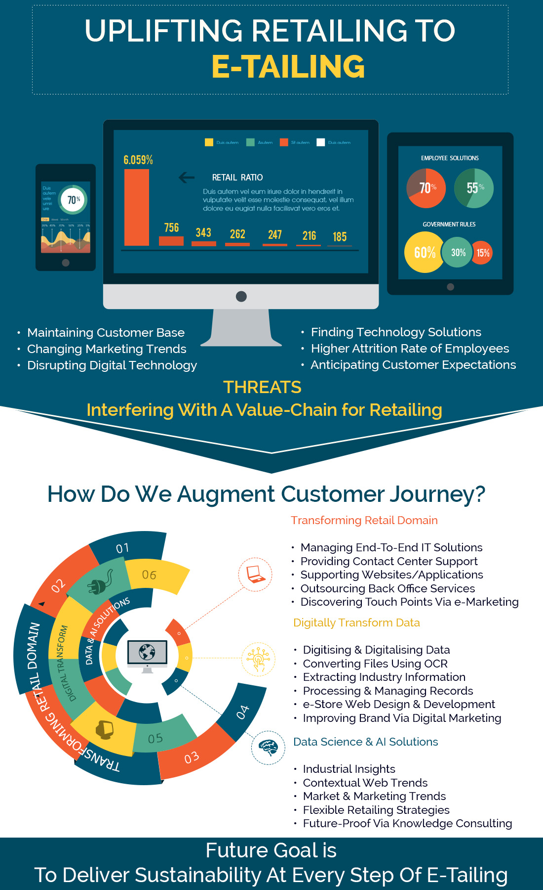 Retail is one of the fastest growing industries, which is dynamic and frequently accelerating. Herein, the corporate life of retailers is more than just selling consumer goods or services. They reach customers through different channels of distribution. Their aim is to rank on the leading position over the internet so that profit margin can be bigger than ever. We, at Eminenture are here to transform your retail journey, making it ultra easy with our innovations, deep research, values and assessment for the future under business process outsourcing (BPO).
